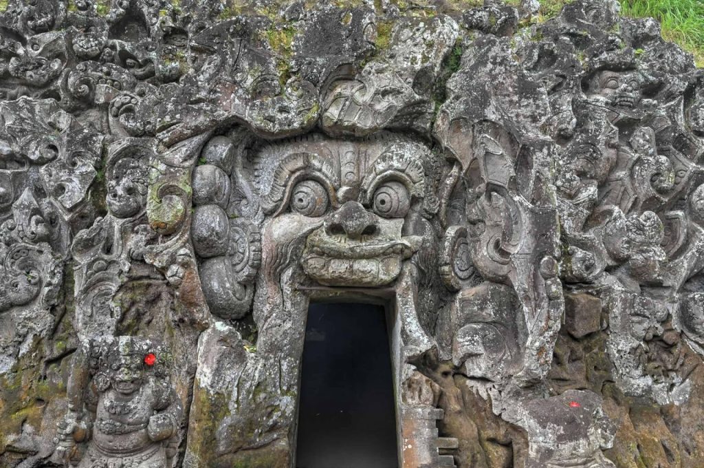 Daya tarik paling mencolok dari Goa Gajah adalah relief wajah raksasa yang terpahat di pintu masuk gua.